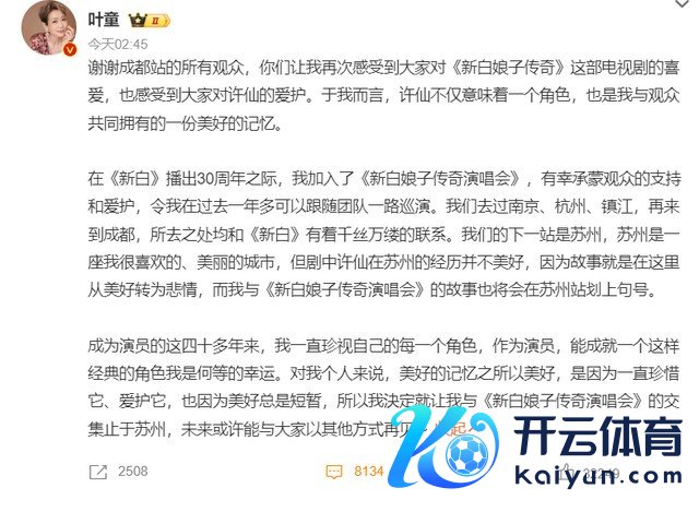 大略便是鉴于个东谈主感受和市集响应口碑下滑,在新白娘子据说成齐演唱会限度后,主演叶童就文告不再参与,休止新白娘子据说演唱会的配合。叶童发文说:“成为演员的这四十多年来,我一直羡慕我方的每一个变装,动作演员,能建立一个这么经典的变装我是多么的幸运。对我个东谈主来说,好意思好的缅想之是以好意思好,是因为一直珍惜它、羡慕它,也因为好意思好老是少顷,是以我決定就让我与《新白娘子据说演唱会》的错杂止于苏州,畴昔大略能与全球以其他表情重逢~”叶童使命室也转发,并说叶童在苏州站之后将不再参与新白娘子据说演唱会,但巡演会不竭。
