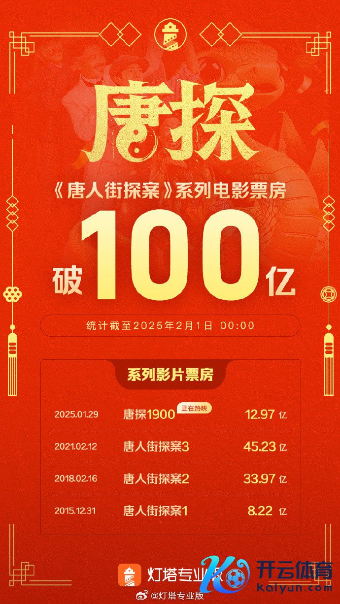 2月1日,《唐探1900》及时票房达12.97亿元,同期唐探系列电影累计总票房冲突100亿元,成为中国影史首个百亿票房系列电影。