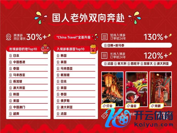 携程发布的《2025年春节旅游总论断述》骄傲,跨境游成为蛇年春节旅游阛阓增长引擎。跨境游举座订单同比旧年增长三成,其中入境游门票订单同比旧年增长180%,入境游旅舍订单同比增长超6成。国东说念主赴外洋过年,老外来华过中国年,国际流量的注入与“非遗版春节”在社媒上的鄙俚传播使得ChinaTravel升级为ChineseNewYear,国东说念主老外已毕双向奔赴,交换所在过新春佳节。