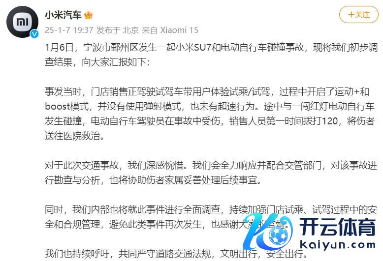 小米汽车称,1月6日,宁波市鄞州区发生一齐小米SU7和电动自行车碰撞事故。