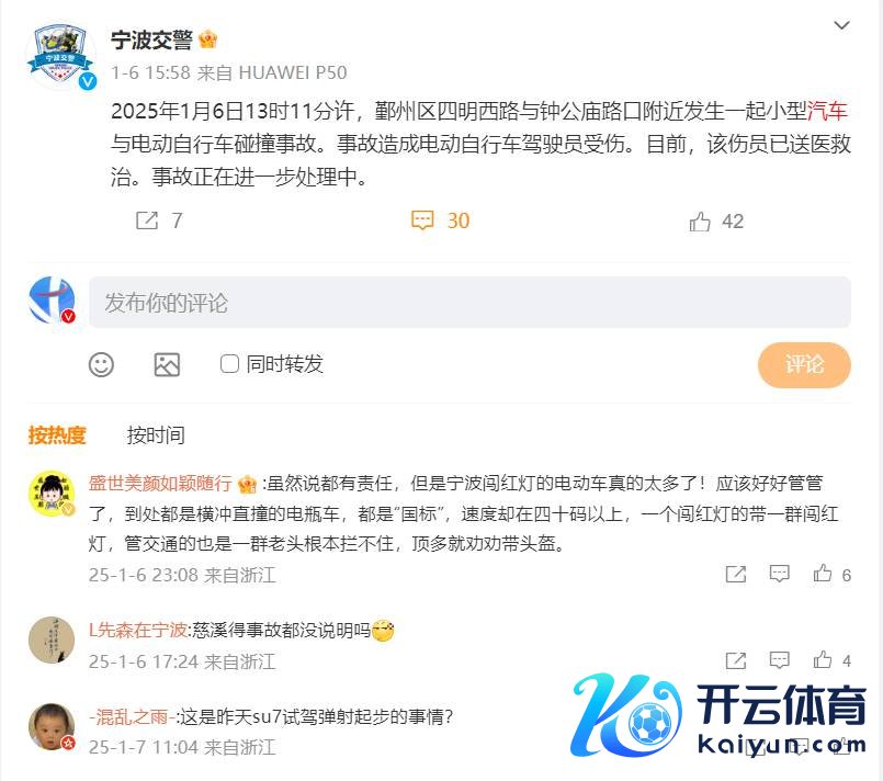 1月6日晚间开云体育,宁波交警官微曾发布通报称,2025年1月6日13时11分许,鄞州区四明西路与钟公庙路口隔邻发生一齐袖珍汽车与电动自行车碰撞事故。事故变成电动自行车驾驶员受伤。现在,该伤员已送医救治。事故正在进一步处理中。(中新经纬APP)