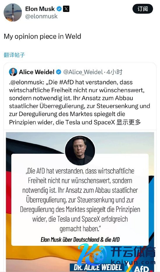 这篇著作被德国遴荐党2月23日提前选举的总理候选东谈主爱丽丝·魏德尔在马斯克的酬酢麇集 X 上援用,这位亿万财主随后转发了这篇著作。 《宇宙报》指定主编 Jan Philipp Burgard 在专栏磋商中写谈,马斯克认为将德国遴荐党归类为极点主见是失误的,这是一个紧要失误,他指出了该党在与欧盟和俄罗斯的联系以及侨民问题上的态度。