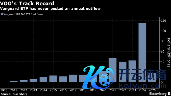 彭博汇编的数据表露,2025年头依然有接近180亿好意思元资金流入Vanguard的标普500指数ETF(代码:VOO),是排行第二位的五倍多,而且该ETF昨年以1160亿好意思元的年流入畛域糟塌了历史记载。该基金的金钱已飙升至6260亿好意思元,行将跨越当今民众最大ETF——SPDR标普500ETF信赖(代码:SPY)的6370亿好意思元。