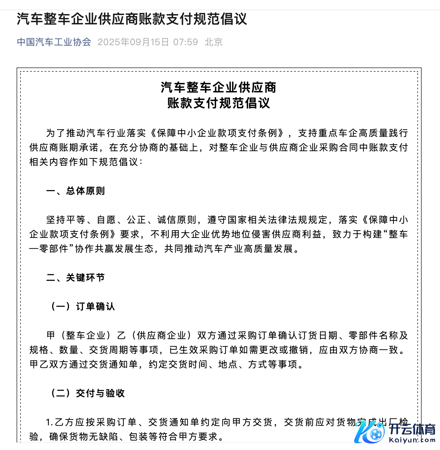 9月15日,中国汽车工业协会(简称“中汽协”)发布《汽车整车企业供应商账款支付范例倡议》,此举为了鞭策汽车行业落实《保险中小企业款项支付条例》,撑执重心车企高质地践行供应商账期愉快。