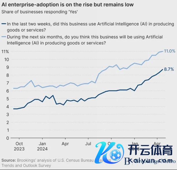 企业说明现时或缠绵使用东说念主工智能本领的比例合手续高潮,是东说念主工智能在好意思国经济中影响力扩大的最明确缠绵之一。凭证好意思国东说念主口普查局(United States Census Bureau)的“买卖趋势与瞻望窥伺”(BTOS),在分娩商品或服务中履行使用东说念主工智能的企业比例,从2023岁首的约4%高潮至2025年中的8.7%。企业对近期应用东说念主工智能的预期更高,最新窥伺夸耀,11%的企业缠绵在改日六个月内取舍东说念主工智能。这些趋势标明,企业层面的东说念主工智能整合正在稳步股东。