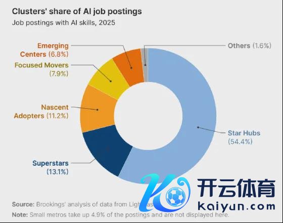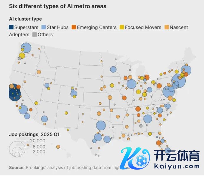 注:本图基于布鲁金斯学会对Lightcast职位发布数据的分析,展示了六种东说念主工智能集群类型在好意思国的地舆分散。圆圈大小代表2025年第一季度东说念主工智能职位发布的数目。读者可拜谒原文网站稽查更详备的交互式图表。