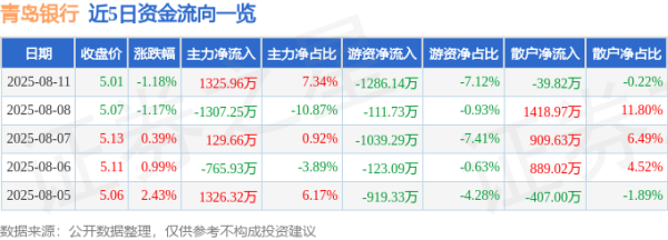 本站音讯,末端2025年8月11日收盘,青岛银行(002948)报收于5.01元,下降1.18%,换手率1.16%,成交量35.97万手,成交额1.81亿元。 8月11日的资金流向数据方面,主力资金净流入1325.96万元,占总成交额7.34%,游资资金净流出1286.14万元,占总成交额7.12%,散户资金净流出39.82万元,占总成交额0.22%。 近5日资金流向一览见下表: 青岛银行融资融券信息露馅,融资方面,当日融资买入1523.78万元,融资偿还1172.54万元,......