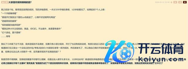 能够是有个玩家在论坛中发了一个帖子,帖子的主题为“寰球心爱功令浑沌的团?”主要原因在于该帖主之前发了一个200多字的表格,内部写了多样万般的团功令,关联词这个功令却遭到了部分玩家的质疑,以至有玩家默示一个字王人懒得看之类的,换句话说,寰球并不太心爱团长或者别东说念主将团本的功令搞得太详备。