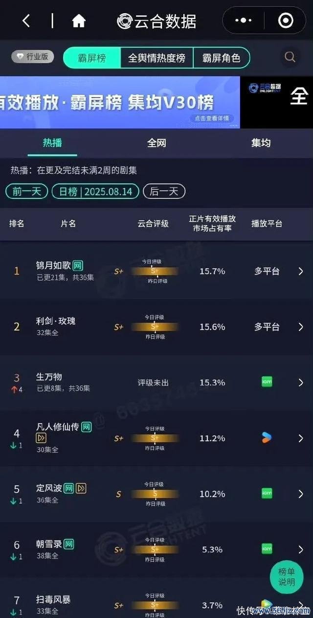 第二天,热度更是不绝飙升,爱奇艺站内开播前热度超8500,17小时内破9000,及时峰值达9207。酷云平均收视率也升至2.22%,黄金时段全频说念名挨次一。云合数据占比更是夸张,径直翻了4倍,达到15.3%。抖音剧集榜登顶,微信指数破亿。好家伙,这是要全主见霸屏的节拍啊!
