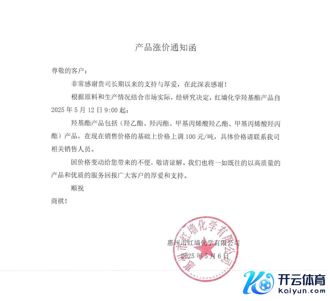 红墙股份发布羟基酯居品加价告知函红墙股份发布羟基酯居品加价告知函