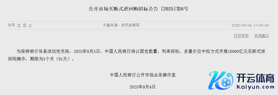 央行:9月5日将开展10000亿元买断式逆回购操作 期限为3个月开云体育央行:9月5日将开展10000亿元买断式逆回购操作 期限为3个月