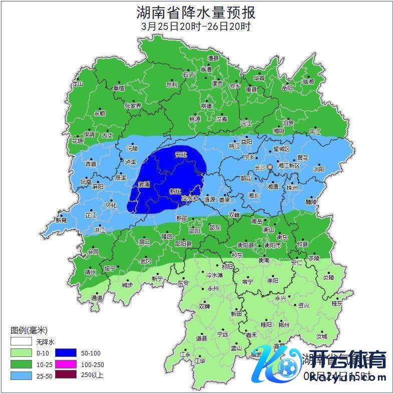 25日晚上至26日日间,湘北、湘中阴天有中到大雨,其中怀化(市区、溆浦、辰溪)、益阳(安化)、娄底(新化、冷水江)、邵阳(隆回)有暴雨,其他地区阴天有阵雨或雷阵雨;北风2~3级,雷雨时阵风7~9级;最低气温湘南14~17℃,其他地区9~13℃;最高气温湘南20~25℃,其他地区16~20℃。