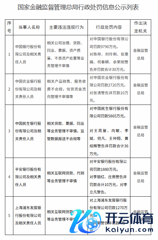 10月31日,金融监管总局网站泄漏的行政处罚信息公示列表表现,中国银行、民生银行、农业银行、祥瑞银行、浦发银行5家银行估量被罚金2.1525亿元,多位关联职守东说念主员被处以训导或罚金。
